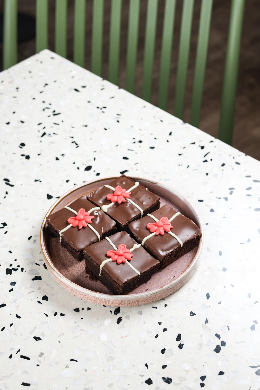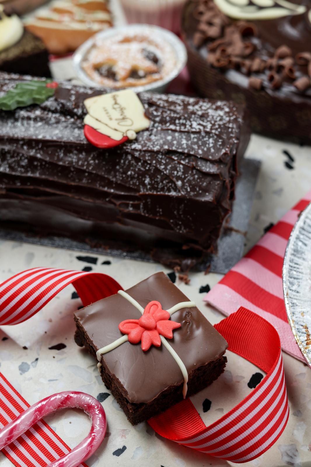 A rich, fudgy chocolate brownie topped with silky milk chocolate and finished with a delicate white chocolate and fondant bow. Full of festive indulgence in every bite.