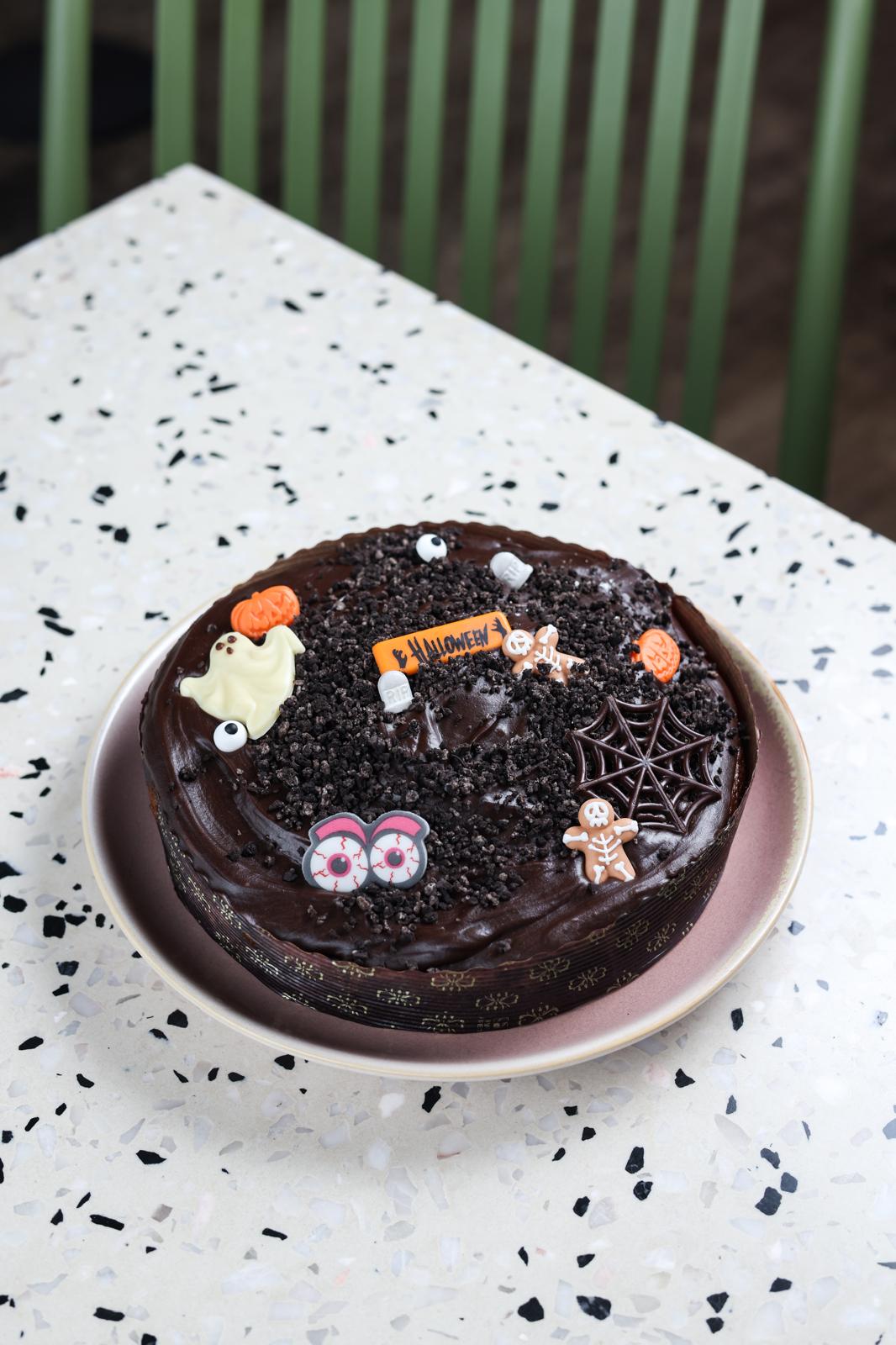 Moist and fluffy chocolate sponge cake loaded with Belgian Chocolate ganache, Oreo crumb and an assortment of scary Halloween decorations.