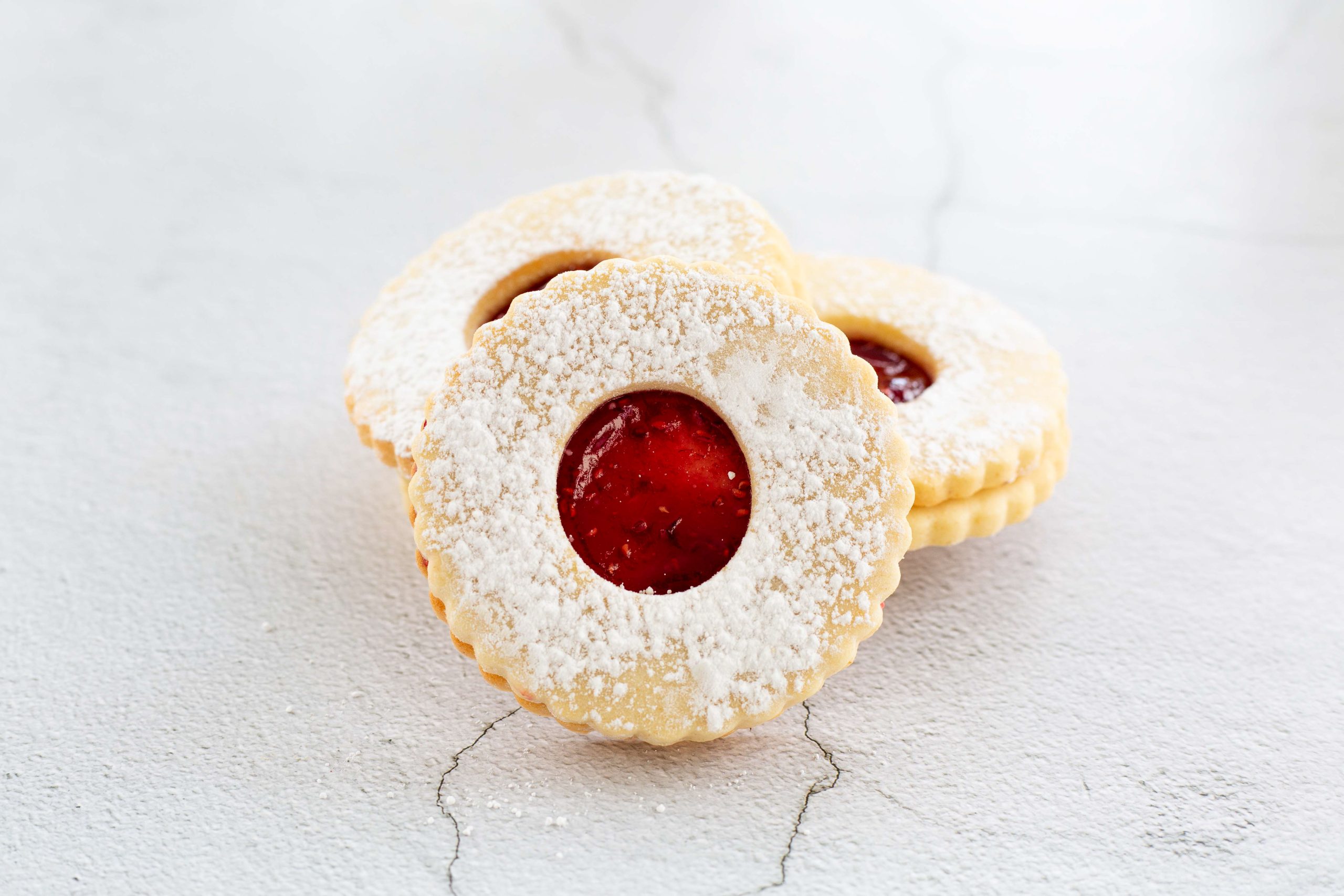 A box of 4 delightful buttery shortbread with homemade raspberry jam splodged between two